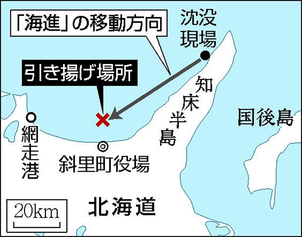 作業台船「海進」を運航しているのは、海上保安庁と契約した「日本サルヴェージ」。23日に水深約115メートルの沈没地点からカズワンをワイヤでつり上げ、深さ約20メートルの海中にカズワンをつったまま、水深の浅い斜里町沖約7キロの海域に向かっていた。同海域で、いかりを下ろして海進の船上にカズワンを引き揚げる予定だった。